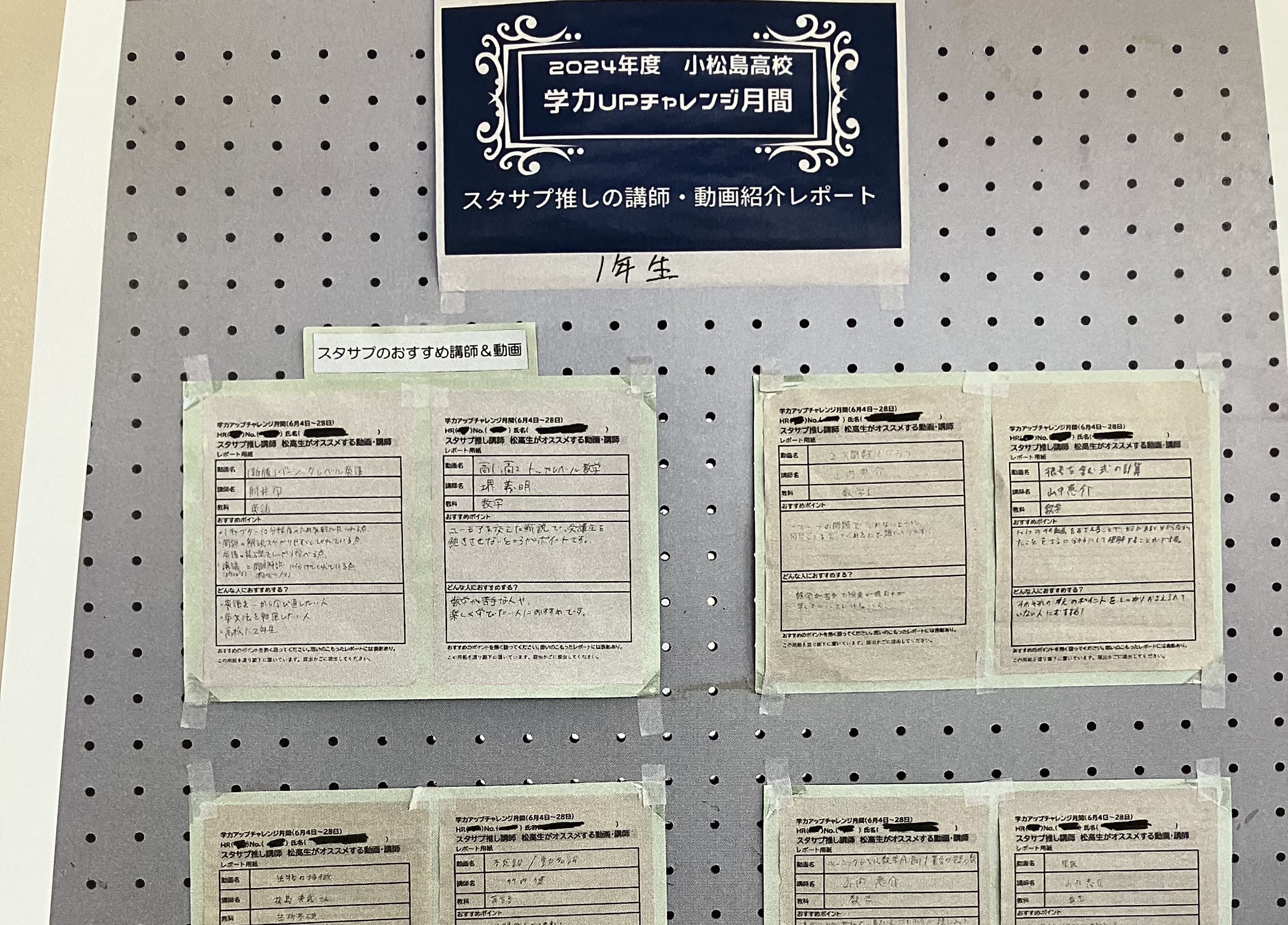 実力テストのない6月・11月に設定しているイベントで、生徒が楽しく意欲的に学習へと向かえるような短期目標を設定。たとえば「推しの講師を紹介しよう!」では、自分がよく視聴する『スタディサプリ』の動画に登壇する先生をレポート形式で紹介。それを掲示・シェアすることで自己肯定感の形成につながり、互いの新たな一面も発見できます。生徒が主体的に動画を探す姿勢を養うという目的もあります。