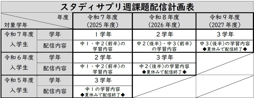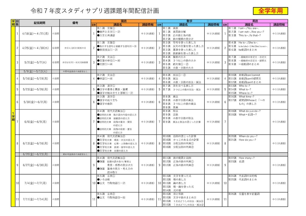 基礎学力の定着に向けて、国語・数学・英語の3教科では、中学校範囲の基礎的な内容を扱った「週課題配信」をスタディサプリにて行っています。場当たり的に課題を出すのではなく、進路指導部主導のもと、事前に年間配信計画表を設計し、高校3年間を通して義務教育範囲の内容をじっくりと総復習できるよう、プログラムを組みました。