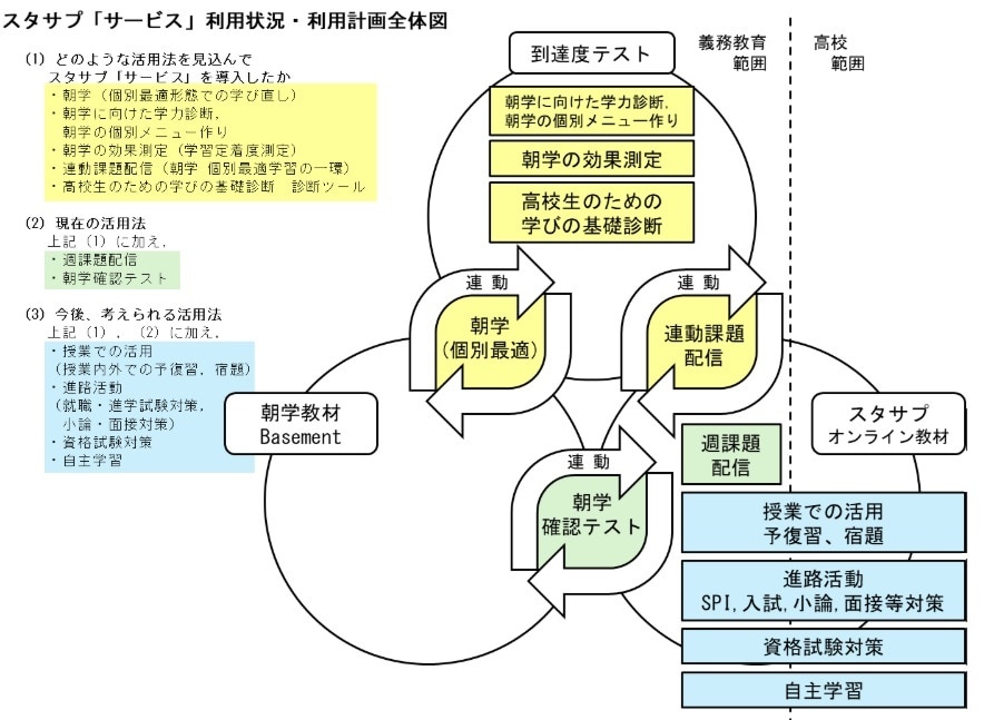 今後に向けて、スタディサプリの活用領域はさらに拡大できると考えています。授業での予習・復習はもちろん、進路活動(就職・進学試験対策、小論文・面接対策)、資格試験対策などへの展開も視野に入れています。また、取り組みの質を高める工夫も検討しています。到達度テストの分析結果を生徒に分かりやすくフィードバックしたり、朝学や週課題の取組状況を生徒同士で確認し合ったりする機会を設けることも考えられます。